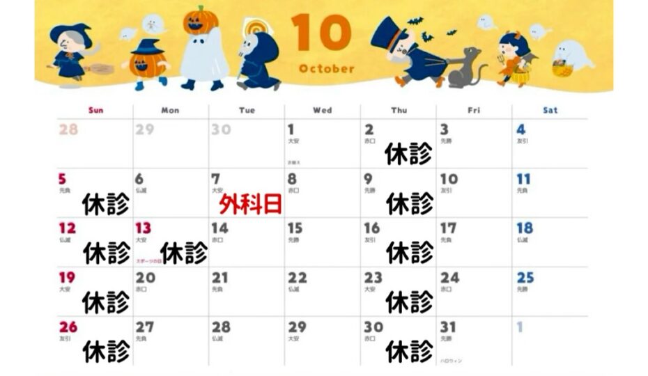 ⋆⸜ 10月診療日カレンダー🎃👻 ⸝⋆ 2025.09.19 10月もよろしくお願い致します⋆꙳月火水金 9:00〜13:00 / 14:00〜18:00 土 9:00〜13:00 / 14:00〜17:00休診日 / 木・日・祝 ☏℡ 087-880-8246 ⋆⸜ 9月診療日カレンダー☀️🍇 ⸝⋆前の記事 ⋆⸜ 11月診療日カレンダー🍄🤎 ⸝⋆次の記事